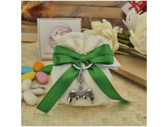 Sacchettino chiuso sul retro in modo da togliere il portachiavi e poterlo aprire per mangiare i confetti senza sfare il fiocco