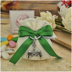 Bellissima torta di sacchettini porta confetti con portachiavi a forma di consolle da videogames come playstation ,realizzato in metallo in Italia.Confezionato su nastri in doppio raso come in foto