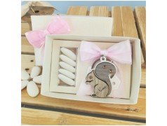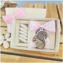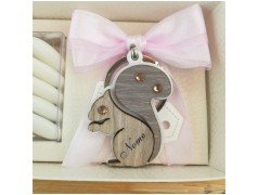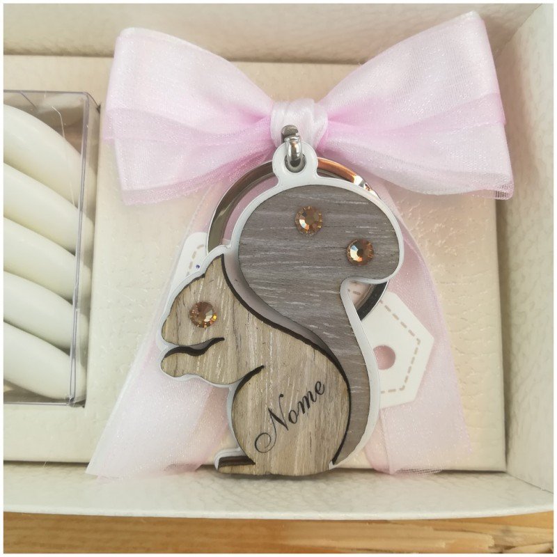 Bellissimo portachiavi a forma di scoiattolino personalizzato realizzato in metallo e legno inciso al laser con il nome del festeggiato Confezionato con scatola combinata e blister porta confetti