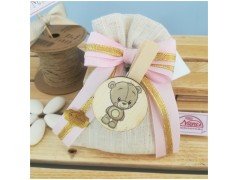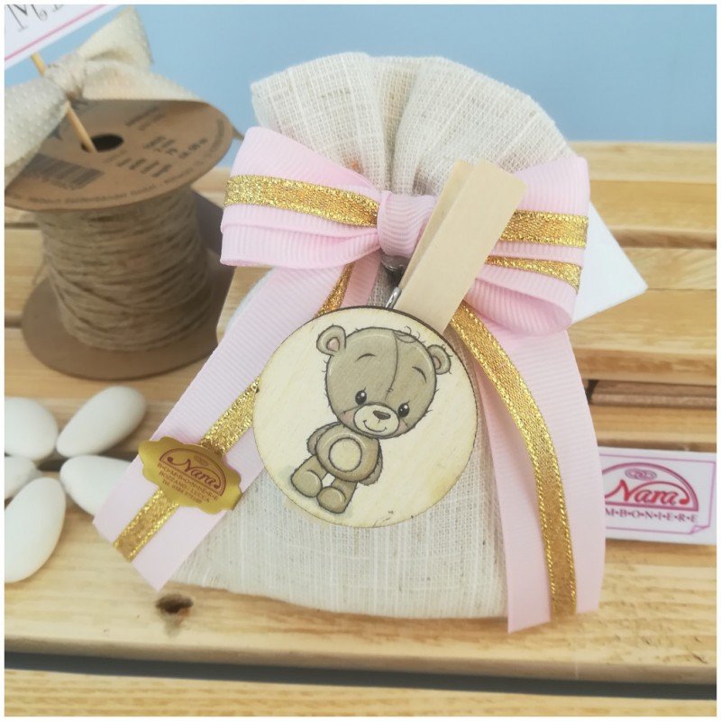 Sacchettino bomboniera porta confetti in stoffa con molletta in legno con tag circolare con disegnato un orsacchiotto da bambina