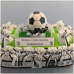 Le bomboniere arrivano già confezionate con confetti nastri bigliettino stampato e campo da gioco porta bomboniere incluso nel prezzo.La palla centrale è un salvadanaio e nel centro del campo cè stampato il campo da gioco e le porte da calcio sono in 3d di plastica bianca