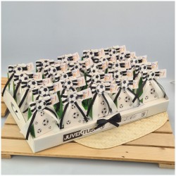 La Fede Bianconera: Il confezionamento sartoriale non lascia spazio a dubbi. Ogni scatolina è chiusa da un grintoso doppio fiocco in Raso Bianco e Nero, i colori della Vecchia Signora, su cui spicca l'applicazione a forma di Pallone da Calcio.