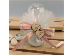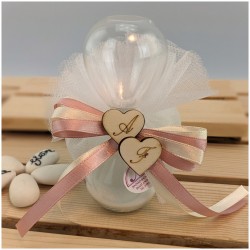 Bellissima clessidra in vetro con sabbia bianca con cuori in legno inciso con le iniziali degli sposi confezionato con confetti legati sul retro con nastri bigliettino e scatola con nastri messi in modo da poterla aprire senza sfare il fiocco