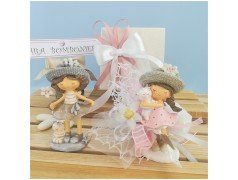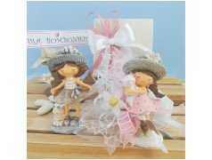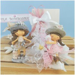 Bellissime bomboniere originali bambine in resina dipinte a mano con cappello in testa in due modelli assortiti, vendute con sacchettino nastri confetti e scatola