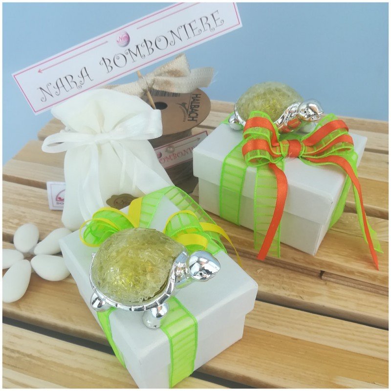 Bellissima tartaruga in resina argentata con guscio giallo "cracke'" confezionata con scatola e confezione