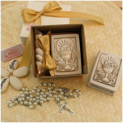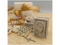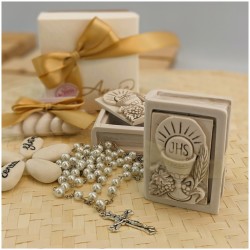 Bellissima scatolina a forma di vangelo in pietra leccese con all'interno il rosario. Nella parte anteriore della scatola c'è raffigurato il calice della comunione in bassorilievo.