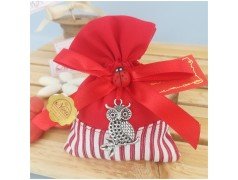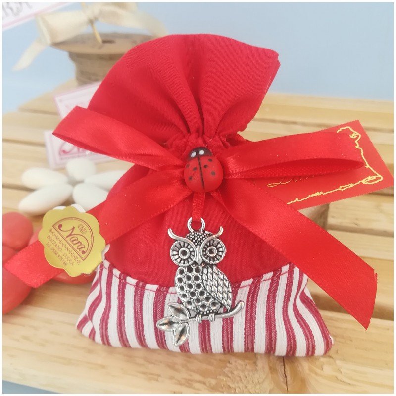 Bellissimo sacchettino semplice in tessuto bicolore con nastri, ciondolo a forma di gufo e confetti all'interno