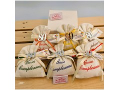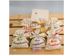 • Sacchettino in stoffa con la scritta Buon compleanno applicazione