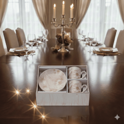 Elegante cofanetto con coppia di tazzine e piattini decorati con delicato motivo floreale, ideale come bomboniera utile per Matrimonio.