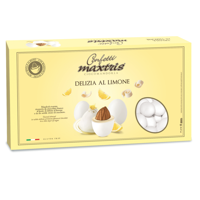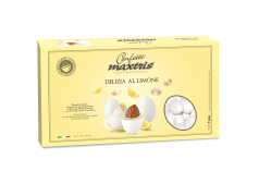 Confetti Maxtris aromatizzati di Italiana Confetti al gusto di delizia al limone . Morbido e goloso confetto con all' interno la mandorla ricoperta da cioccolato bianco aromatizzato ed un sottile strato di zucchero vanigliato