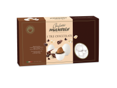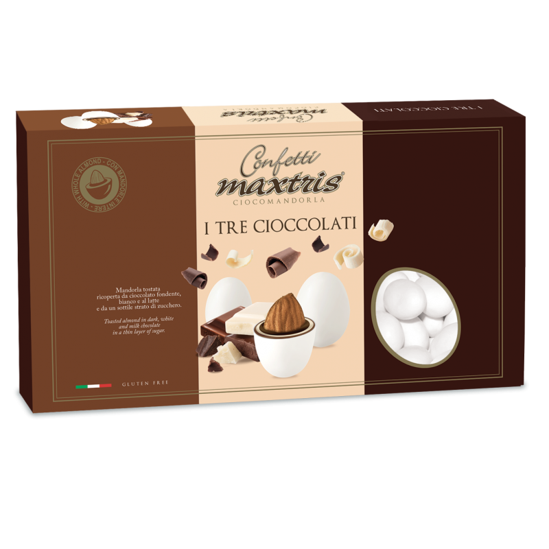 Confetti Maxtris aromatizzati di Italiana Confetti al gusto di Tre cioccolati in un unico confetto . Morbido e goloso confetto con all' interno la mandorla ricoperta da cioccolato bianco, latte e fondente aromatizzato ed un sottile strato di zucchero vanigliato