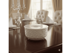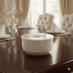 Pratico contenitore salvafreschezza in porcellana con texture floreale a rilievo e valvola di sfiato, ideale come bomboniera utile da cucina.