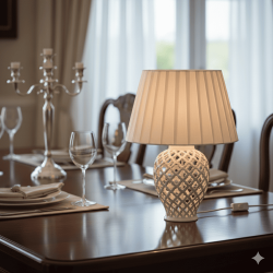 Elegante lampada da tavolo con base in porcellana lavorata a traforo e paralume plissettato, ideale come regalo importante per Matrimonio.