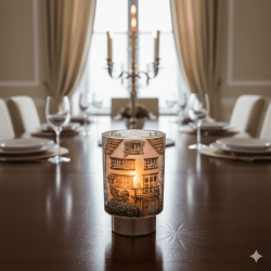 Delizioso cilindro in vetro con illustrazione di una casa rosa antico e base satinata color bronzo, ideale come bomboniera home decor.