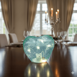 Moderna lampada d'atmosfera a forma di cuore in vetro color acquamarina con texture crepata, ideale per 18° Compleanno, Comunione o cerimonie estive.