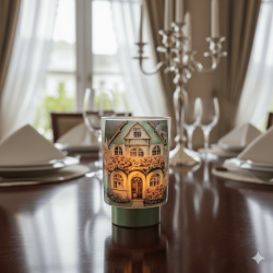 Bomboniera Hervit Porta Candela in Vetro con Decoro Casetta Fiorita e Base Verde