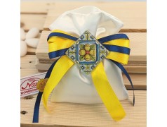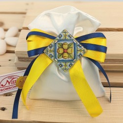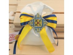 Bellissimo sacchettino porta confetti in doppio raso con magnete realizzato in vetro serigrafato con colori accesi giallo blu in stile mediterraneo con nastri gialli e blu navi