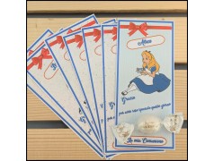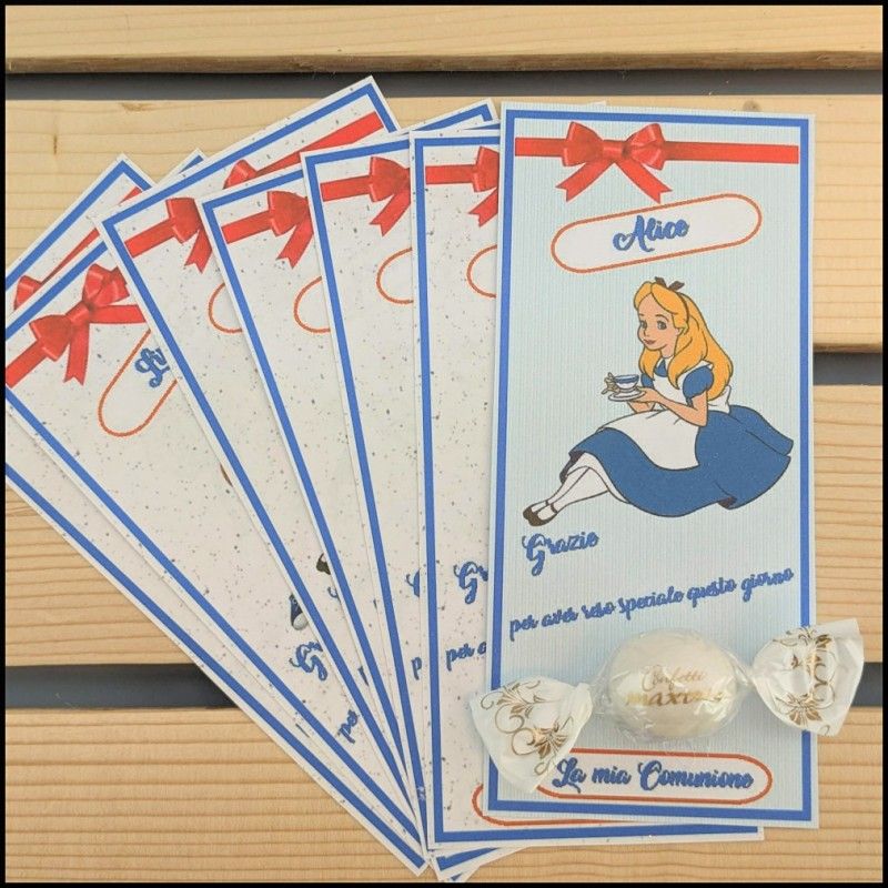 Segnaposto per comunione con Segnaposto Alice nel paese delle meraviglie realizzato in cartoncino stampato con il nome del festeggiato