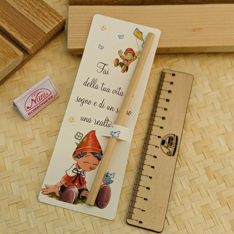 Segnaposto per comunione o compleanno realizzato in cartoncino stampato con Pinocchio e una matita con possibilità di personalizazione
