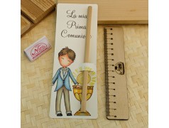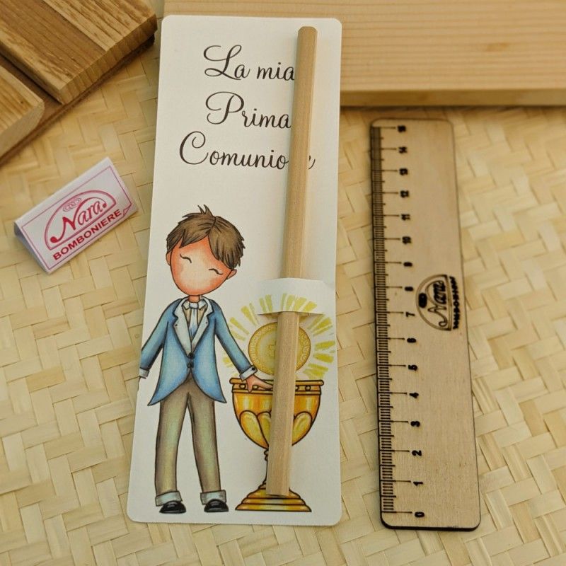 Segnaposto per comunione o compleanno realizzato in cartoncino stampato con un bambino accanto al calice della prima comunione e una matita con possibilità di personalizazione